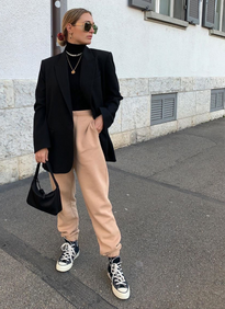 Looking chic doesn't mean you have to give up on your comfort. Whether your're wearing a sports bra, hoodie, or crop top, you can't go wrong with layering a blazer, button down, or crewneck over it. Wear any of your comfy bottoms from leggings to biker shorts. Add some gold jewlery and a pair of chunky sneakers, and your ready! You look put together, without having to ditch the sweatpants.
